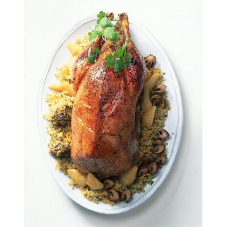 Notre oie rôtie à la broche est préparée dans la plus pure tradition, offrant une viande tendre et juteuse sous une peau dorée et croustillante. Sa chair généreuse en fait une pièce maîtresse idéale pour les repas de fête ou les grandes tablées conviviales. l'Oie est servie avec son jus convient pour 8 personnes.